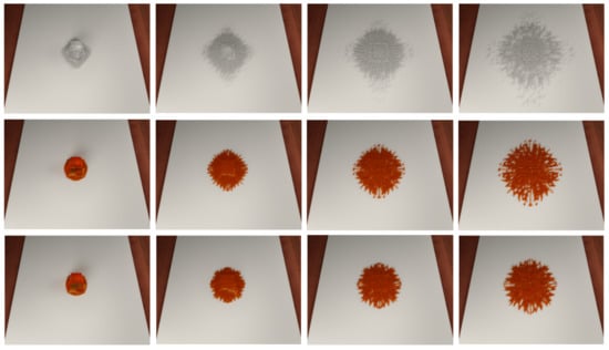 The third experiment is a fluid volume dropping on a planar solid object. This experiment compared Newtonian fluid [] with non-Newtonian fluid for the boundary handling effect, as shown in Figure 8. As can be seen from the upper row of the figure, when the Newtonian fluid is interacting with the container boundary, the fluid particles are obviously dispersed due to lack of viscosity. However, the non-Newtonian fluid exhibits a strong adhesion effect (see the middle and lower row), and the particles are tightly bound together. Besides, comparing the middle row with the lower row, the viscous effect and absorbing solid effect is better when using our friction boundary condition. It is visible that fluid particles at the edge appear unreasonably fracture phenomenon in the middle row of Figure 8 while the lower row does not exhibit this problem. The settings and parameters are shown in Table 1.