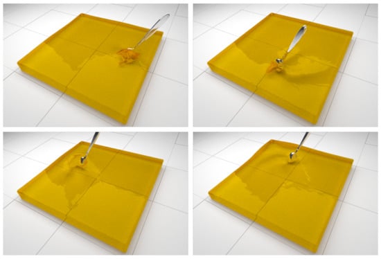 - Goktekin, T.G.; Bargteil, A.W.; O’Brien, J.F. A method for animating viscoelastic fluids. ACM Trans. Graph. (TOG) 2004, 23, 463–468. [Google Scholar] [CrossRef]