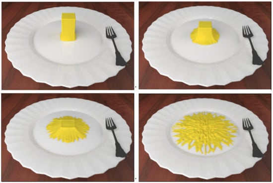 The fifth experiment exhibits the simulation of melting butter in a plate (Figure 10). In this scene, the butter is gradually melting, particles are closely gathered by the viscous force which also well presents the characteristics of Non-Newtonian fluid. The visual effect is in accord with the real scenario. The settings and parameters are illustrated in Table 2.