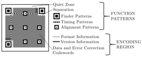Figure 1 shows an example of a QR code structure [21]. It can be seen that the structure is made up of encoding regions, as well as function patterns. Function patterns do not encode data and are used for retrieving specific information about the QR code, e.g., its version and error correction level. The encoding region is made up of data codewords and error correction codewords. Each codeword contains eight bits. Data are encoded in a QR code as a stream of bits, which is divided into a sequence of codewords.