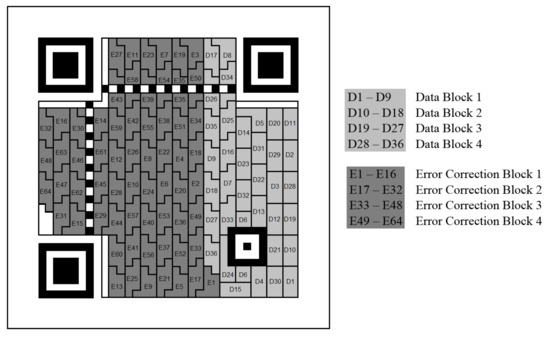 The data and error correction codewords in a QR code are divided into one or more blocks. The specific number of blocks, along with the total number of data and error correction codewords, is determined based on the QR code version and error correction level. Within each block, the error correction codewords are appended to the end of the data codeword sequence and encoded within the blocks in an interleaved manner. The purpose of this is to reduce the likelihood that localized damage will result in an undecodable QR code. Figure 2 depicts the arrangement of data and error correction codewords within a Version 4 QR code, with error correction level H.