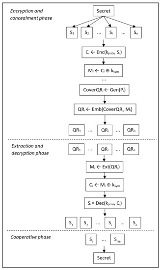 Figure 3 provides an overview of the proposed secret sharing protocol using QR codes and symmetric keys. The aim of the proposed protocol is to encrypt and conceal shares within QR codes in order to be able to distribute the shares via public channels without raising suspicion. Only authorized individuals who have the appropriate credentials can extract and decrypt the information to obtain the shares. Subsequently, a qualified number of group members must cooperate before the secret can be revealed. The overview depicted in Figure 3 divides the overall process in to three phases, namely the encryption and concealment phase, the extraction and decryption phase and the cooperative phase. The details of phases will be described in the subsections to follow.