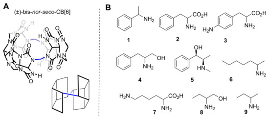 (A) One enantiomer of (±)-bis-nor-seco-CB[6]; (B) chiral guest whose binding was studied with (±)-bis-nor-seco-CB[6].