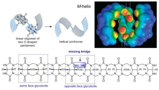 Map of electronic potential of a single enantiomer of the (±)-glycoluril decamer in the shape of an M-helix (adopted with permission from [33]) and its structure.