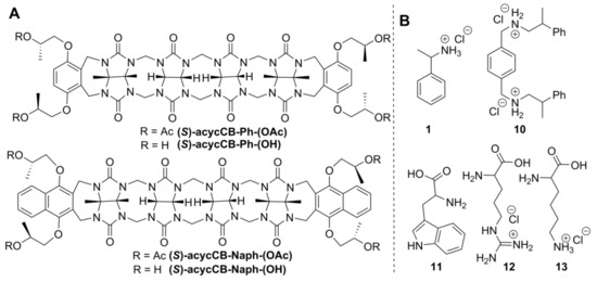 (A) Chiral acyclic CBs; (B) chiral guests, whose binding was studied with acyclic CBs [37].