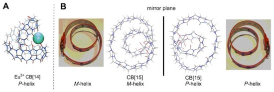 (A) (Eu3+·CB[14]) side view of P-helix [34]; (B) top view of (Cd2+·CB[15]) in M- and P-helical conformations formed in the same crystal [36] and illustration of these helix configurations with a belt.
