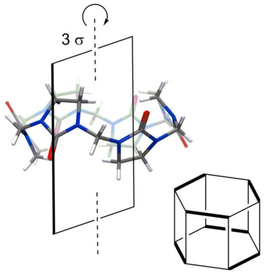 In general, the structures of core cucurbiturils are very symmetric. The CB[6] has seven planes of symmetry, as shown in Figure 2. Three vertical planes of symmetry pass through urea oxygens and three vertical planes through methylene bridges; additionally, one horizontal plane goes through the equator of the macrocycle.
