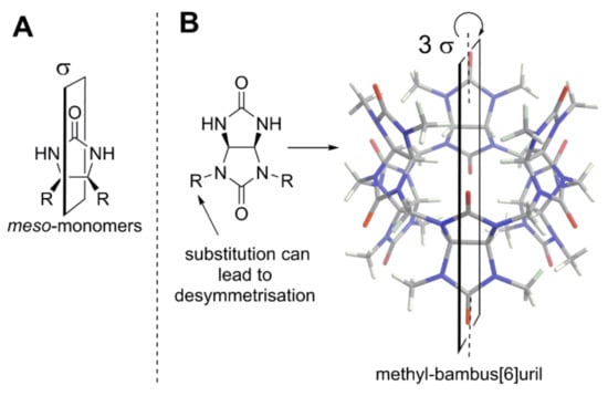 (A) The general structure of achiral substituted ethylene urea; (B) crystal structure of achiral methyl-bambus[6]uril [43] and its monomer.