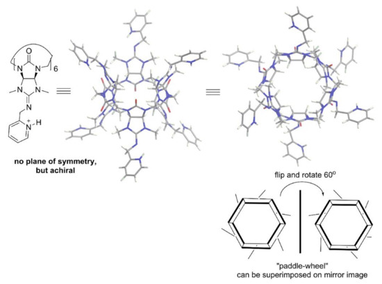 The alkyl-azabambusuril crystal structure [44] revealed its “paddle-wheel”-like configuration. The unidirectional orientation of the imine double bonds in azabambusuril (Figure 9, right side), reflects high diastereoselectivity during their formation. Curiously, in spite of the desymmetrization of bambusuril monomer, alkyl-azabambusuril is achiral, as its mirror image can be superimposed by flipping and rotating this “paddle-wheel” (Figure 9). Nevertheless, in the future chiral bambusurils could be made from nonuniformly substituted monomers.