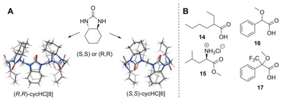 (A) Structure of cyclohexa-1,2-diylurea and crystal structure of chiral cycHCs [45,47]; (B) chiral guests whose binding was studied with cycHCs [47].
