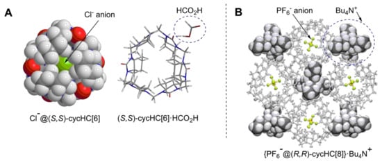 (A) Minimum energy geometry of inclusion complex of Cl−@(S,S)-cycHC[6] and external complex of (S,S)-cycHC[6]·HCO2H [48]; (B) crystal structure of (PF6−@(R,R)-cycHC[8])·Bu4N+ [49], Published by The Royal Society of Chemistry.