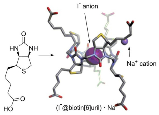 Biotin structure and crystal structure of the (I−@biotin[6]uril)·Na+ complex [46].