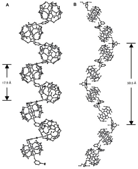 The first helical structure formed upon complexation of the achiral ligand with CB was reported by Kim et al. [53]. A helix was constructed based on ammonium cation-dipole interaction between a guest and CB and silver cation-dipole interaction between pseudorotaxanes. A polyrotaxane chain was formed from CB[6], N,N′-bis(3-pyridylmethyl)-1,5-diaminopentane and AgNO3. The crystal structure had an equal number of right- and left-handed helixes, so it was racemic. (Figure 13, on the left). Later, along with several achiral polyrotaxanes, another helical racemic polyrotaxane was reported by Kim’s group [54]. In that, a silver ion was exchanged with a cadmium ion, and as a result, a longer helical pitch was formed (Figure 13, on the right).