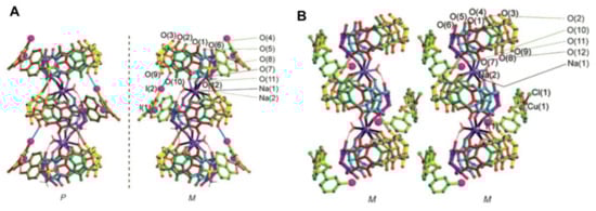(A) Racemic [CB[6]Na2·Cu(3,5-diiodosalicylate)(8-hydroxyquinoline-5-sulfonate)]; (B) homochiral [CB[6]Na2·Cu(3-iodobenzoate)(8-hydroxyquinoline-5-sulfonate)Cl]. Reproduced from [56].