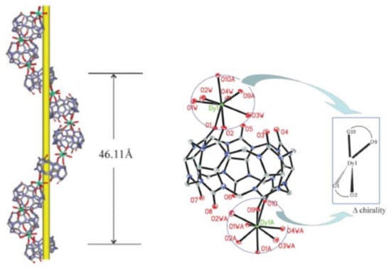 In the crystal structure with a P-helix, two carbonyl groups of CB[5] are coordinated to Dy3+ and as every Dy3+ is connected with two CB[5] molecules; also, Dy3+ is chiral and has the ∆-configuration. The authors attempted also a measurement of circular dichroism (CD) of single crystal, but unfortunately could not detect a reliable CD signal. The absolute configuration was assigned by single crystal diffraction analysis through the Flack parameter. Intriguingly, randomly performed crystallizations showed that two clusters crystallized in the space group P65, whereas the other six clusters crystallized in the space group P61. In other words, the sample in the present case had undergone spontaneous resolution with an enantiomeric excess value of 50% [57]. Formation of similar helical networks has also been observed with heavy lanthanides like Er3+, Yb3+ or Lu3+, but not with light lanthanides [58].