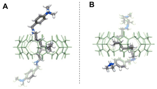 N,N′-bis(4-dimethylaminobenzyl)-dodecane-1,12-diamine folded inside of the CB[8] (A) into a right-handed helix; (B) into a left-handed helix [59].