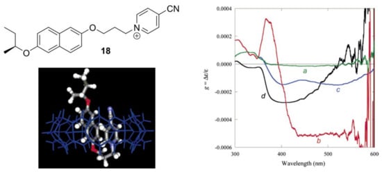One of the most reliable methods to detect chirality is CD. Cucurbiturils’ carbonyl-group UV-absorbance is below 250 nm and coincides with the cut-off region of the many organic solvents, therefore the signal of a chiral guest is often used for interaction studies. One of the parameters that reflects chirality, the concentration independent value of the g-factor, is a good measure of chirality sensing. Inoue and Kim et al. [62] have shown that the g-factor of chiral charge transfer dyad 18 can be affected by complexation with CB[8] (Figure 17).