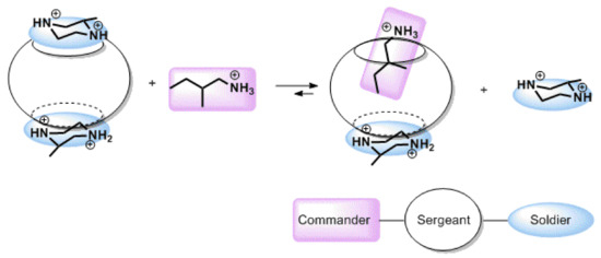 One step further from the creation of a chiral complex of CB through binding with a chiral guest is the compilation of a ternary system that can show stereoselectivity. The very first and very comprehensive study in this direction was done by the group of Inoue and Kim [63]. They investigated a number of ternary systems and found that the CB[6] complex with (R)-2-methylpiperazine is especially selective toward complexation with (S)-2-methylbutylamine (K = 15,000 ± 3000 M−1) if compared with the complex between (S)-2-methylpiperazine with (S)-2-methylbutylamine (K = 800 ± 100 M−1) (Figure 18). A matched enantiomer is bound with 19-times greater affinity than the mismatched enantiomer. It was claimed to be the highest enantioselectivity ever reported for a supramolecular system derived from an achiral host. To explain such a selectivity, an analogy to the commander–sergeant–soldier [64] system was exploited. Binding to CBs is governed by the hydrophobic effect related to the guest’s ability to enter the CBs’ cavity. Double-charged methylpiperazine is designated as a soldier, and it is weakly bound to CB at portals; it cannot enter the cavity, but can attract two CBs, causing aggregation of the CB·methylpiperazine complex. Aggregation can be minimized at a concentration below 0.3 mM. CB is designated as the sergeant, and its role is to mediate the formation of diastereomeric complexes between two ammonium compounds. 2-Methylbutylamine is the commander, as its binding controls the formation of the final complex. The mismatching enantiomer of 2-methylbutylamine induces an unfavorable change of enthalpy, leading to an endothermic reaction, which is explained by the unfavorable change in the geometry of the bound methylpiperazine. The matching enantiomer of 2-methylbutylamine, on the other hand, does not disturb the complex between CB and bound methylpiperazine and is therefore overall strongly favored, and its binding leads eventually to disaggregation of the CB complex. In addition, in this work, selectivity toward diastereomeric dipeptides was shown [63].