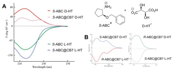 The most recent study on a ternary system with two chiral compounds and CB[7] was published by Day et al. [65]. They observed that chiroptical properties of chiral organic salts can be affected by the formation of CB complexes. The most illustrative example of the effect of CB[7] is the change in the CD signal of diastereomeric pairs of chiral (S)-ammonium-2-benzyoxycyclopentane (R- or S-ABC+) salts with hydrogen tartrate (l- or d-HT−) (Figure 15). The additional absorption band is induced in the signal of one diastereomer (S-ABC@CB7·d-HT, the positive CD signal), as the other diastereomer signal retains the same λmax (S-ABC@CB7·L-HT, negative CD band) (Figure 19A). CB[7] has the same influence with respect to enantiomeric ammonium tartrate salts, and the sign of the Cotton effect is dictated by the chiral salt itself and is opposite for the signal for the enantiomeric pairs (Figure 19B).