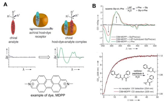 Based on the phenomena that chiral compounds can induce CD signal upon complexation with achiral molecules and that CB[8] forms a complex with two aromatic guests, Biedermann and Nau [66,67] developed a wonderful analytical method for the detection of chiral amino acids, peptides, proteins and aromatic drugs (Figure 20). Some examples of the application of this method are outlined in Figure 20B. One can follow the formation of some particular chiral product that chemoselectively forms a complex with a CB[8] sensor. In this sensor CB[8] acts as a host and fluorescent dye, for instance dimethyldiazaperopyrenium (MDPP), serves as a signaling unit. For example, during enzymatic hydrolysis of racemic glycyl–phenylalanine dipeptide (Gly-d/l-Phe), only one enantiomer is digested, and l-phenylalanine (l-Phe) is formed, while the Gly-d-Phe dipeptide remains intact. The binding constant of l-Phe (450 × 103 M−1) to supramolecular sensor MDPP@CB[8] is much higher, compared with binding of Gly-d-Phe (7 × 103 M−1) dipeptide; therefore, the [l-Phe·MDPP@CB[8]] complex is mainly formed, and l-Phe can be sensed through the CD signal of the ternary complex (Figure 20B, top). It is also remarkable that the kinetics of the enzyme reaction can be monitored by following the formation of a single enantiomer. Hippuryl-phenylalanine dipeptide hydrolysis kinetics, which was determined through the CD signal of the CB[8]-sensor system, coincides with conventionally measured UV-outcome, but in the first method, one can directly monitor enantioselectivity of the reaction and assign absolute configuration of the product.