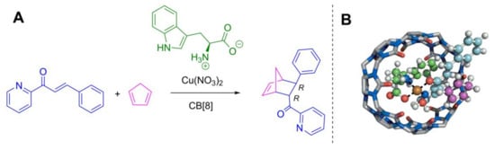 (A) Diels-Alder reaction catalyzed in a CB-nanoreactor; (B) lowest energy geometry of the complex of Cu2+, H2O, tryptophan, azachalcone and CB[8] with cyclopentadiene approaching in the endo direction [68].