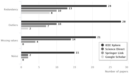 Data quality issues such as missing values, outliers and redundancy have received greater attention from research community (papers found: 39, 47 and 55 respectively). Meanwhile noise (17 papers) has been paid less attention because it is defined as general consequence of the data measurement errors.