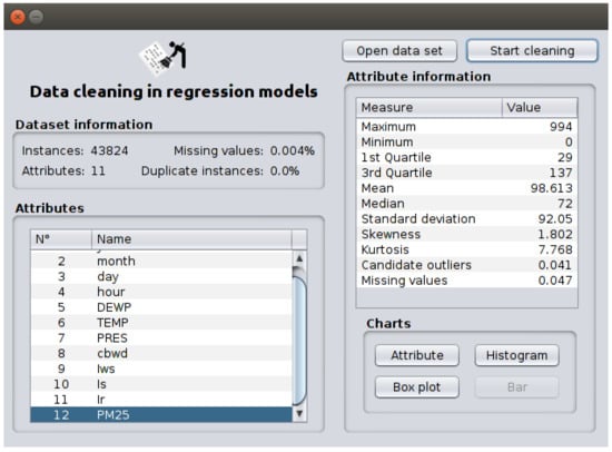 - Graphical User Interface (GUI) enables an user of DC-RM interact with the algorithms of data cleaning through graphical elements, such as text, windows, icons, buttons, text fields, etc. We developed two main forms in NetBeans IDE 8.2. The first form presents statistic information related with the dataset (number of attributes and instances,percentage of missing values and duplicate instances) and its attributes (mean, median, skewness, kurtosis, etc.) as show Figure 4. The second form (it appears when the button “Start cleaning” of the first form is pressed) presents the algorithms for each data cleaning task and the DC-RM process. In Figure 5 is depicted the second form when the chi–squared algorithm is applied in the dimensionality reduction phase.