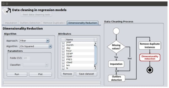 - Dimensionality reduction: reduces the number of attributes finding useful features to represent the dataset [61]. A subset of features is selected for the learning process of the regression model [49]. The best subset of relevant features is the one with least number of dimensions that most contribute to learning accuracy [62]. Dimensionality reduction can take on four approaches: