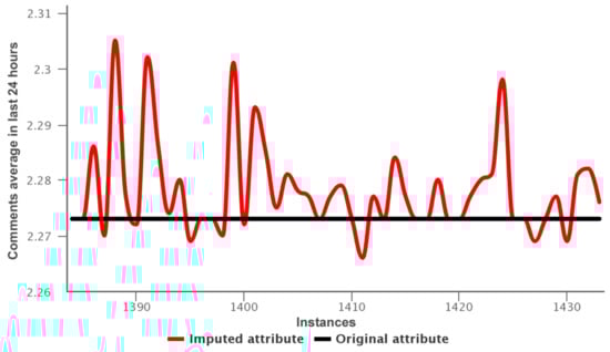 In Figure 6, we observed the imputed values are around 2.225–2.305, while the original values are 2.273. Thus the imputation obtained by random forest reaches a mean absolute error 0.01. Other imputation for the attribute 31: comments in last 24 h of the data training—variant 2 is shown in Figure 7.