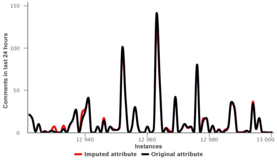 Random Forest reaches low MAEs in the imputations (MAE lowest: 0 in attribute 22 Variant 3, and MAE highest: 1.214 in attribute 31 of Variant 3 ). In contrast with Mean Imputation, the attributes 6, 15, 13, 29 shown in Table 4 have a MAE greater than 54.445. This happens because the imputation values were added on the center of the sample, diminishing the importance of values on the tails. Thus Random Forest was the algorithm used for impute the missing values. Figure 6 presents the imputed (red line) and original values (black line) for attribute 6 (comments average in last 24 h of the data training—variant 1).