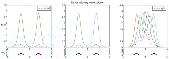 Figure 1 displays eight stationary wave solutions using the two-bump configuration and . The left panel shows two symmetric solitary wave solutions including the lower amplitude wave (blue dashed), which is the near zero solution denoted by . Two non-symmetric wave solutions (with lower and higher amplitude, respectively) are shown in the middle panel. The right panel represents four stationary wave solutions which consist of two symmetric solutions and two non-symmetric ones. The blue dashed wave illustrated in the right panel of Figure 1 depicts the solitary wave solution which is trapped between two bumps similar to (-type wave is placed in the middle of two bumps). Let this be referred to as a trapped solitary wave solution and denoted by . In this study, we focus on the dynamics of these trapped solitary waves, (a higher amplitude wave in the middle of two bumps) under various bump configurations.