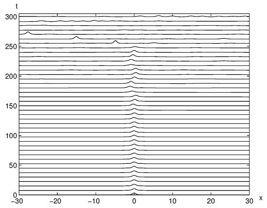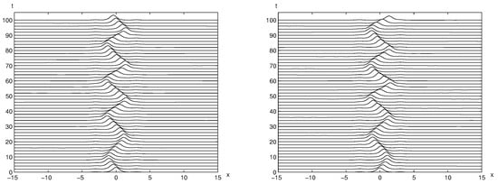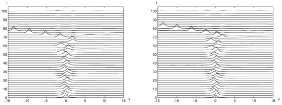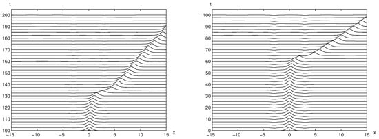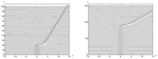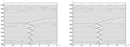 It is well known that the near zero wave solution is stable with respect to time when either single positive symmetric bump or two positive bumps is given. The solitary wave solutions with two higher amplitudes (the solid curves in the left panel of Figure 1) are moving out fast since they are placed right over the bumps and this makes them unstable in a very short time. However, the trapped solitary wave which is placed between two bumps ( in the right panel of Figure 1) remains stable for a very long time as observed []. Here, the time evolution of the trapped solitary wave, is revisited in Figure 2 and Figure 3. The unperturbed trapped solitary wave solution () remains stable between two bumps until in Figure 2. Figure 3 displays the time evolutions of perturbed trapped solitary wave solutions with and perturbation, respectively. Under perturbations, trapped solitary waves start moving out of two bumps around . It is worth noting that the trapped solitary wave consists of the unforced solitary wave and the near zero solitary waves with two bumps. Hence, we can conjecture that the trapped solitary wave remains stable up to a certain time due to the stable interplay between and .