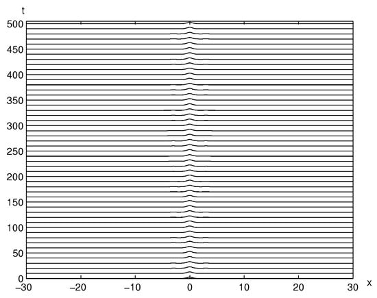 where , . This system is solved at each time step. The computational domain is taken to be b= 50 with and . Our scheme is based on the linearized implicit scheme as proposed in [,]. This scheme is unconditionally linearly stable with a local truncation error, . Therefore, there is no restriction on and (more details on this numerical scheme are found in [,]).