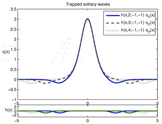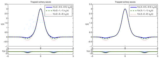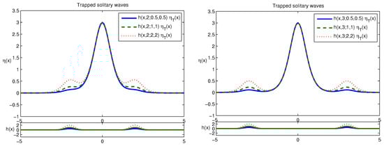 First, stationary trapped solitary wave solutions between two holes are obtained as the distance between two holes is varied. In Figure 11, three stationary trapped solitary wave solutions are displayed under three different bump distance using , and , respectively. Each trapped solitary wave has the shape of around and the near zero negative wave over each hole. Next, Figure 12 illustrates stationary trapped solitary waves as the hole depth is varied, , and . Further, the left panel of Figure 12 shows the trapped solitary waves using the hole distance 2 and the right panel shows the trapped solitary waves using the hole distance 4.
