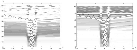 - Zabuski, N.J.; Kruskal, M.D. Interaction of “solitons” in a collisionless plasma and the recurrence of initial states. Phys. Rev. Lett. 1965, 15, 240–243. [Google Scholar] [CrossRef]