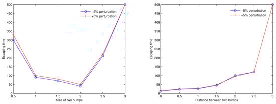The left panel of Figure 10 displays the time when the trapped solitary wave solutions move out of two bumps as the bump size is varied. The time is measured when trapped solitary waves under (solid) or (dotted) perturbation start moving out of two bumps. The time decreases when the bump size increases from 0.5 to 2 so that it takes the minimum around the bump size 2, then the time increases again significantly as the bump size increases. Next, we investigate the relationship between the bump distance and the time until trapped solitary waves remain stable. The right panel of Figure 10 illustrates the time when the trapped solitary wave solutions move out of two bumps as the bump distance is varied. Again, the time is measured when trapped solitary waves under (solid) or (dotted) perturbation start moving out of two bumps. As seen in the right panel, the time increases as the distance between two bumps increases linearly.