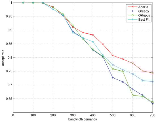 - We demonstrate the efficiency of AdaBa and BgAMBF algorithms by extensive simulations. The results show that our proposed AdaBa can achieve higher acceptance rate compared with popular VC allocation algorithms under different workloads. The proposed BgMBF and enhanced BgMBFSDF algorithm significantly outperform FCFS and other heuristic scheduling strategies.