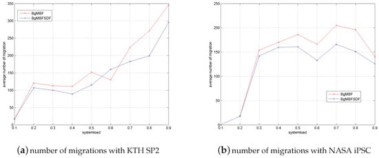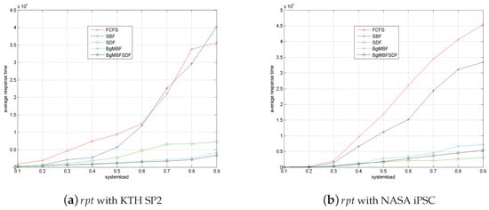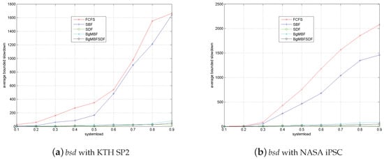 - SDF outperforms BgMBFSDF and BgMBF on average response time for NASA-iPSC, while obtains the worst performance among them for KTH-SP2. Compared with BgMBF, the performance improvement on of BgMBFSDF is also more significant for NASA-iPSC than that for KTH-SP2. The differences above are caused by the different characteristics of these two workloads. In Table 1, it can be seen that the average job runtime for KTH-SP2 and NASA-iPSC is 72.4 min and 10.4 min, respectively. Accordingly, the advantage of SDF is more significant for NASA-iPSC, as more jobs with short duration can be finished before next arriving job comes. For BgMBFSDF strategy, more jobs with smaller duration means more jobs can be finished in advanced through backfilling without migration.
