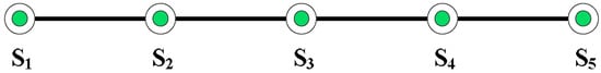 It is assumed that stations S1 through S5 are all SDLA yards, denoted as green circle, and S2 and S4 are candidate nodes for investment. For simplification, we analyze the MML problem in just two periods (Period 1 and Period 2). In addition, we assume that S2 and S4 both have two investment plans for selection in Period 1, including remaining as a SDLA yard and improved to a SDCO yard (expressed by yellow circle in Figure 2). It should be noted that, if the candidate yard remains a SDLA yard in Period 1, it still has two investment plans to choose in Period 2; otherwise, it can only remain a SDCO yard in Period 2, i.e., yard downsizing and closure are not considered (SDLASDCO is feasible, not vice versa). Moreover, we assume that the budget in each period is only enough for expanding one candidate yard from SDLA to SDCO.