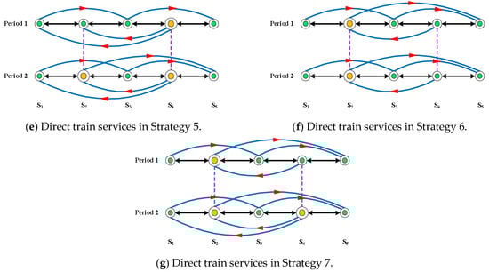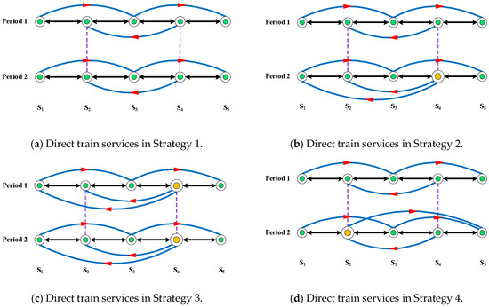 Strategy 1 (see Figure 2a): None of the candidate stations are improved in two periods. In this case, the capital investment is the lowest, while the total operating cost is the highest. There are only three train services between non-adjacent stations, namely, , and .