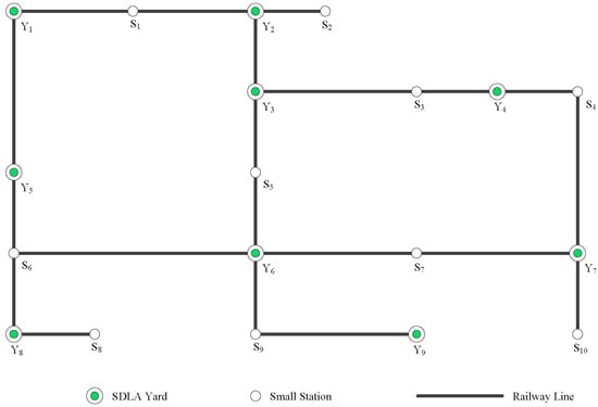 To test the effectiveness and validity of our model, a small railway network containing nine yards (denoted Y1 through Y9) and ten small stations (denoted S1 through S10) is constructed (see Figure 3). It is assumed that these nine yards are all SDLA yards at present, while nine stations have no classification capacity. The parameters of nine yards, such as accumulation parameter, classification cost per railcar, etc., are listed in Table 3.