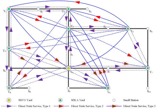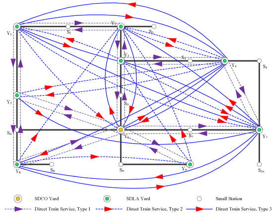 Figure 5 depicts all the direct train services (48 services) provided in Period 2, 12 of which satisfy the sufficient condition; 22 of which are created between adjacent yards; and 14 of which are obtained by the optimization from the remaining 38 train services.