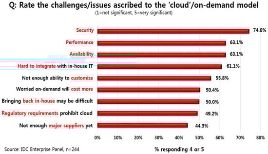 According to an IDC (International Data Corporation) survey in August 2008 [1], security is one of the most challenging tasks in the cloud service. Figure 1 illustrates the results of a multi-aggregation approach to some of the factors that the cloud service should resolve. Among them, security is the most important factor, which means that it is a problem that needs to be addressed. As the number of cloud service users grows, efforts are being made to protect personal information. In addition, in order to provide amicable service, the user’s data stored in the cloud is inevitably processed and stored by the system. However, general users lack the knowledge of this process, so they have difficulty managing data and there is a risk that their personal information will be leaked. In addition, personal information of the user may be leaked from the service provider’s fault or attack by the hacker.