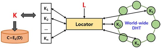 Once the key shares and thresholds are computed, an index is assigned to each key share using the random access key(L) generated by the pseudorandom number generator. The Vanish system stores each key share in the DHT network based on the generated index. At this time, depending on the type of the DHT, if the data destruction time can be specified, the information is also included. If the deployed key shares are less than the set threshold over time, the data object becomes permanently inaccessible. The newly created data object by the Vanish system consists of L, C, N, and T stored in the cloud storage and used in various forms.