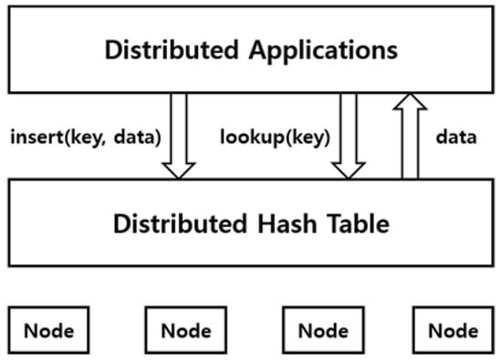 Figure 3 shows the structure and data processing of a distributed hash table. In a DHT based P2P system, data is associated with key value (result of hashing the data), and each node in the system handles a portion of the hash space and is responsible for storing a certain range of key values [5]. When a specific key is searched for data, the system returns the identifier (IP address) of the node storing the data with that key.