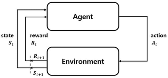 Reinforcement learning is a method in which an agent defined in a specific environment maximizes a reward among selectable actions based on the current state or a machine learning method. Figure 4 shows the basic process of reinforcement learning, which consists of a set of environmental conditions(), a set of behaviors(), and a set of rewards(R). At each point in time , the agent has a state() and possible actions().
