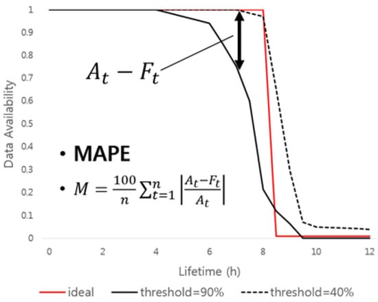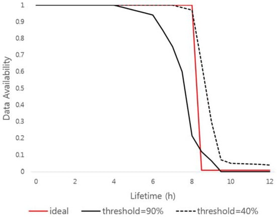 The following is an example of an ideal graph and similarity measure using MAPE for the availability graph of data according to different threshold values in VuzeDHT environment. In this case, the total number of key shares is 10, and the threshold values are 40 and 90, respectively. The data availability graph divides the keys required to encrypt each of the 100 data pieces and distributes them to the DHT network. After 12 h, each key shares are checked to see if the original encryption key can be recovered or not.