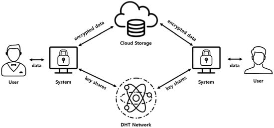 Figure 6 shows an overview of the overall system using the self-destructing scheme. The proposed system can be installed and operated on all users’ equipment using the cloud service, and can be used for cloud storage, email system, instant messages and so on. In addition, the overall system configuration and data flow are not significantly different from those using existing self-destructing schemes. The system installed in the equipment encrypts the user’s data and structures it as a new data object based on the additional information required by the system. The additional information needed at this time is mentioned in the self-destructing scheme. The encryption key is divided into several key shares using Shamir’s Secret Sharing technique, and each of the key shares are distributed and stored on the nodes in the DHT network. The structure of the data object stored in the cloud storage is in the form of (, , , ) and the decryption process is performed in the reverse order of the encryption process. Naturally, all parameters are needed to decrypt the encapsulated data again.