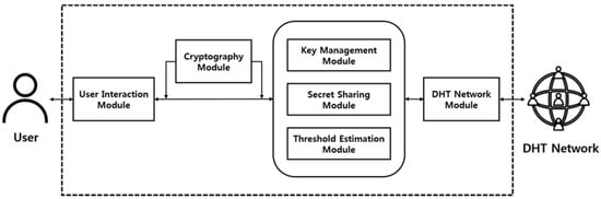 Figure 7 shows the overall structure of the system using the proposed self-destructing scheme. The system consists of a User Interaction Module for receiving data and access time information from the user, a Cryptography Module for performing encryption of data, and a Key Management Module for managing the keys required for encryption. The Secret Sharing Module for dividing the encryption key into several pieces using Shamir’s Secret Sharing, the Threshold Estimation Module for setting the optimal parameters(, ) based on the similarity measurement between the reinforcement learning and the data availability graph, and a DHT Network Module for distributing the generated key shares to the DHT network.