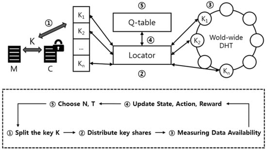 In the DHT network environment, state is defined according to the data availability graph. As the structure of the DHT network changes, we define an action that determines key sharing parameters that are different from the existing ones based on the defined state. Based on the similarity of graphs, we find the optimal threshold with the reward value and distribute the key shares to the DHT network. In particular, an important reason for applying reinforcement learning in the proposed system lies in the dynamically changing characteristics of the DHT.